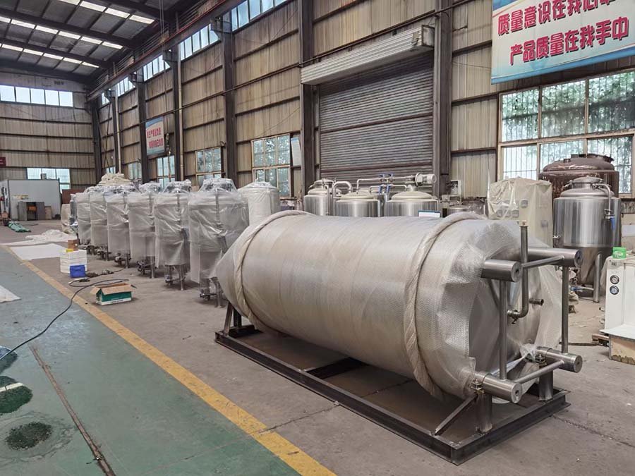 In the busy workshop, a set of custom 5-ton outdoor fermenter tanks is undergoing the final application of polyurethane foam insulation.